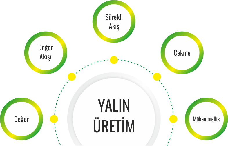 Yalın üretim, mükemmelliğe ulaşmak için uyguladığımız ve hiç bitmeyecek temel disiplin sürecimizdir. Müşteri ihtiyaçlarını tanımlayarak istenilen hizmeti verimli bir şekilde sağlamak için değer zincirimizin bütününe odaklanarak aşağıdaki 5 temel ilkeyi uyguluyoruz;